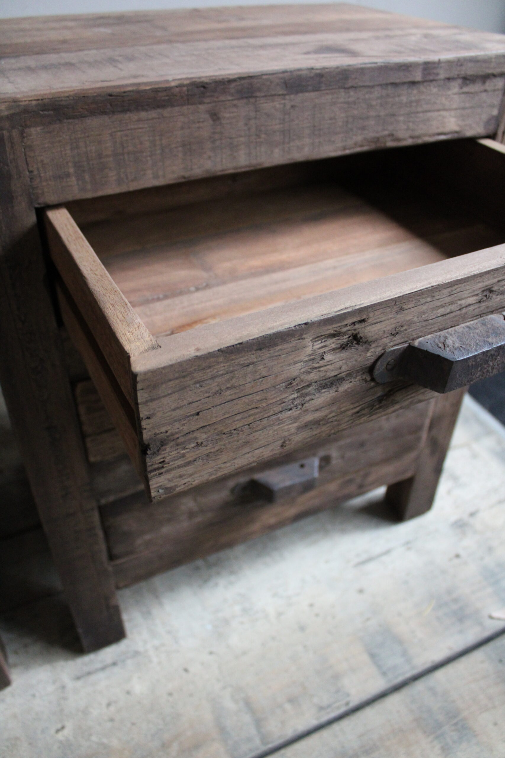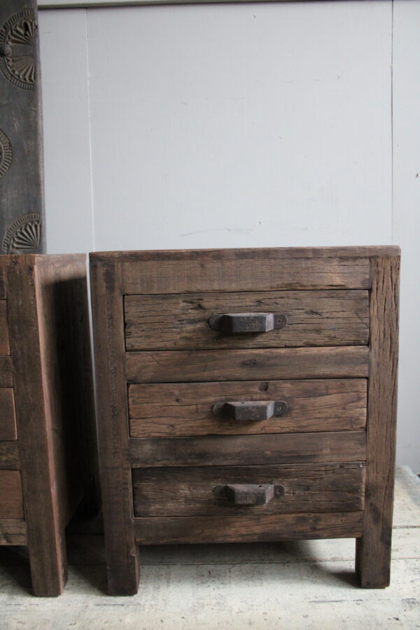 Mooie geheel massieve nachtkastjes gemaakt van driftwood. De ijzeren handgrepen geven ze een stoere look.