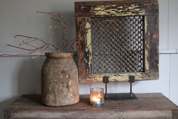 Oud raam ornament uit India geplaatst op een ijzeren voet. Hoogte ± 75 cm Breedte ± 63 cm Diepte ± 7 cm Voet 28 x 17 cm Gewicht 20 kg